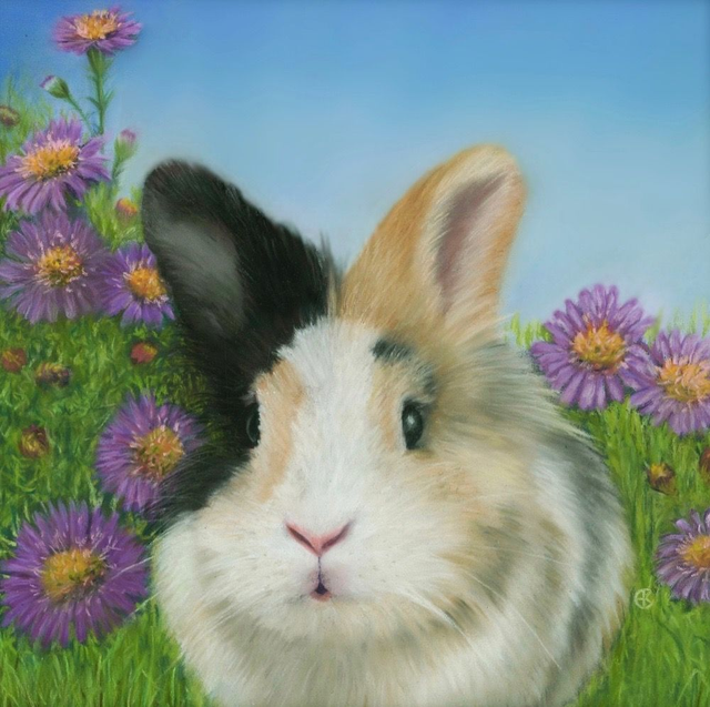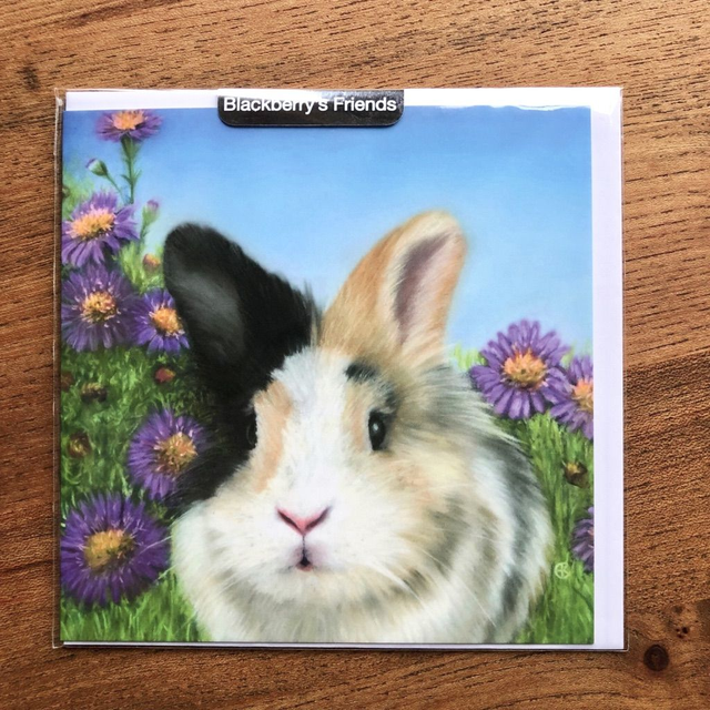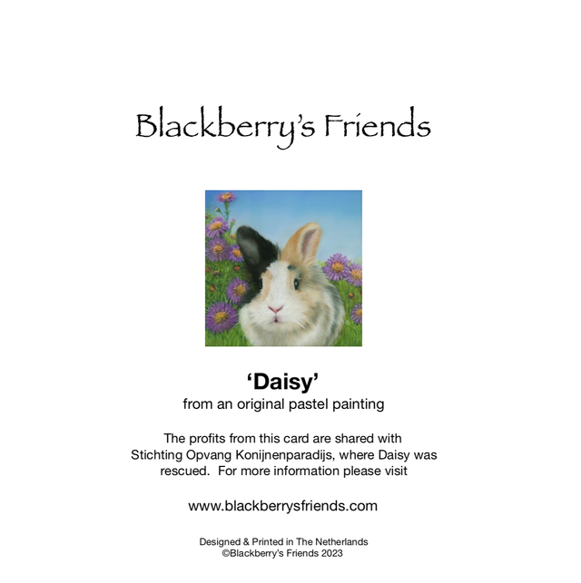 'Daisy' ©2023 from an original pastel painting. 150mm x 150mm with ice white envelope. Blank inside for your own personal message. The proceeds from this card are shared with Stichting Opvang Konijnenparadijs.