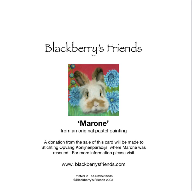 'Marone'© 2023 is from an original pastel painting. 150mm x 150mm with ice white envelope. Blank inside for your own personal message. The proceeds from this card are shared with Stichting Opvang Konijnenparadijs.