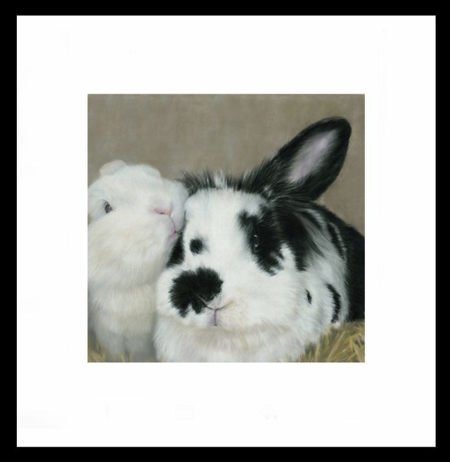 'Sammy & Branca'©2025 from an original pastel painting. Size including border: 205mm x 205mm (unframed), 255mm x 255mm (framed). The proceeds from this print are shared with Stichting Opvang Konijnenparadijs.