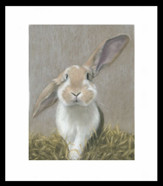 'Dex'©2025 from an original pastel painting. Size 148mm x 210 mm (unframed) including border or 210mm x 297mm (framed). The proceeds from this print are shared with Stichting Opvang Konijnenparadijs.